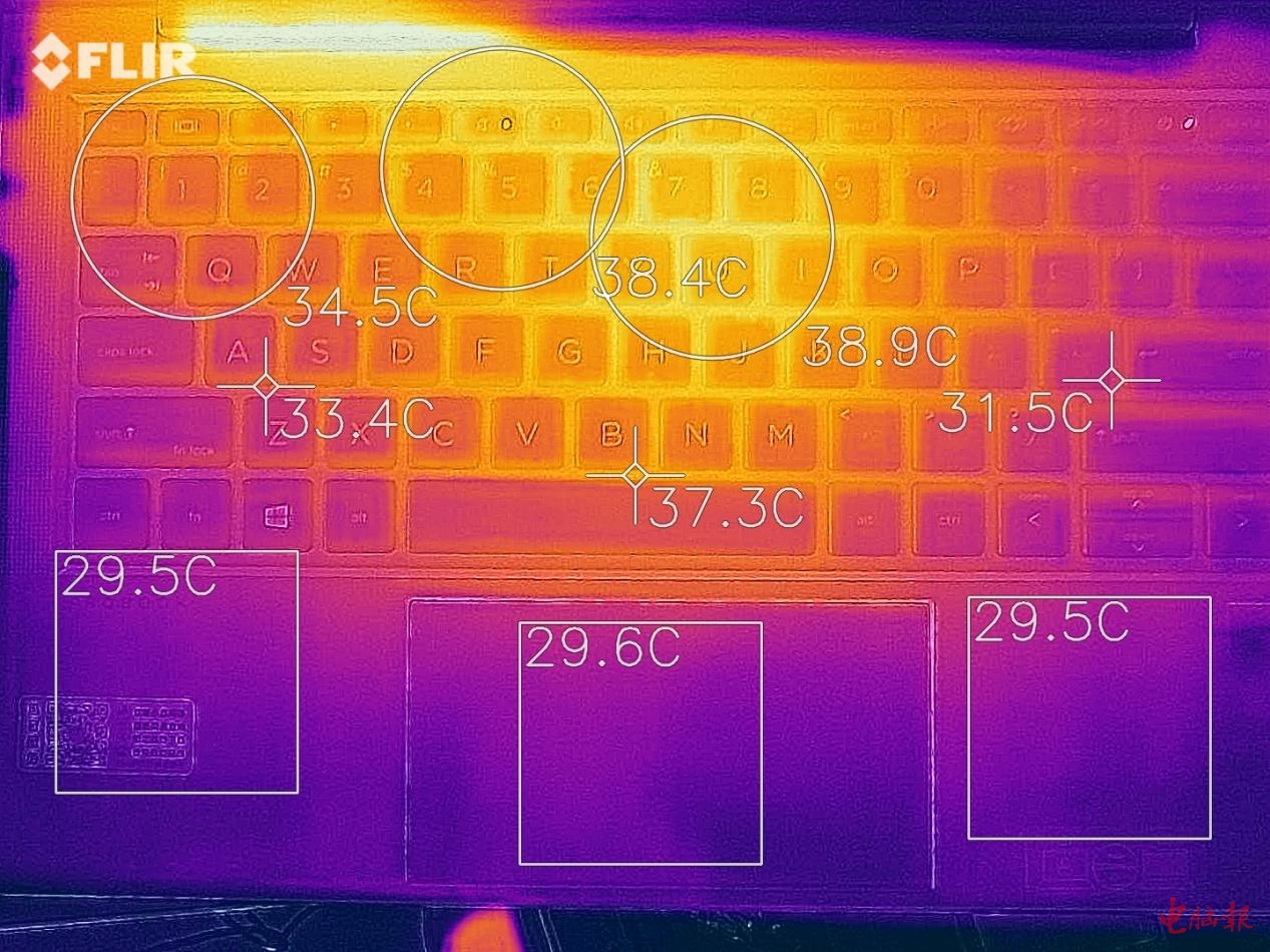 C面热量堆积在键盘中部区域,按键最高的地方是字母U、K附近,温度约39℃,整个C面的温度基本控制在40℃以内。虽然该机是金属C面,但由于内核、表面的温度均不高,所以实际上满载时仅微有热感。噪声方面,键盘上方的噪声约45dBA,用户位的噪声约39dBA,在安静的房间里可听到微弱的风扇噪声,在略显嘈杂的办公环境下,则基本听不到。