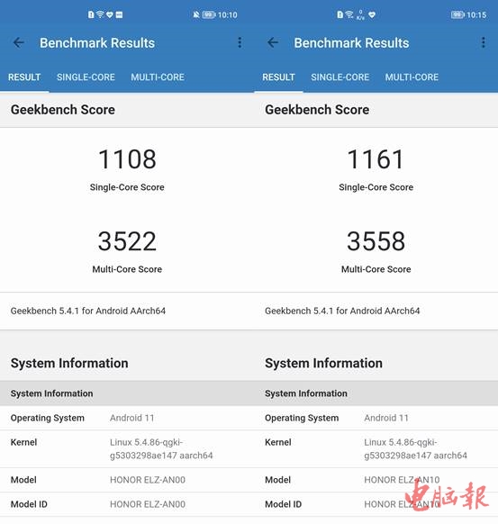 在这组Geekbench5的跑分成绩中我们可以看到,其实搭载骁龙888+的荣耀Magic3 Pro单核/多核得分分别为1161和3558,和目前已经发布的骁龙888+机型差不多。