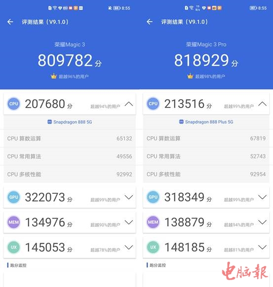 在《安兔兔》(9.1)的测试中,结果也比较类似。荣耀Magic3 Pro得分接近82万,荣耀Magic3则在81万左右,同样只是1万分的差距。在多次测试并比对分数组成后,我们发现每次跑分,荣耀Magic3 Pro的CPU得分几乎都是领先的,荣耀Magic3则是在内存等项目拉回一些分数,这也就造成每次成绩都会有浮动。