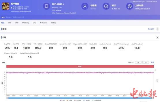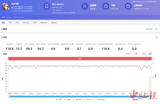可以看到整个游戏过程帧率十分平滑,平均帧率为118.8FPS,这也是因为《QQ飞车》是一款快节奏的游戏,一局比赛一般只有2分钟左右,在界面切换等加载场景会降低帧率,拉低了数据。值得一提的是,整个游戏过程中,有99.3%的时间内,其帧率都保持在100FPS以上,体验很好。