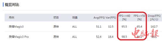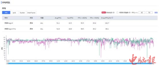 经过半小时的帧率测试,荣耀Magic3平均帧率为51.1FPS,荣耀Magic3 Pro则为52.4FPS,两款手机的平均帧率也没有拉开太大差距。