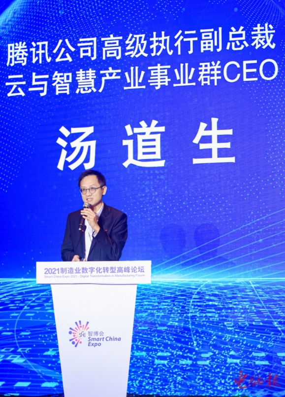 8月23日下午,在2021“智博会”制造业数字化转型高峰论坛上,腾讯公司高级执行副总裁、云与智慧产业事业群CEO汤道生发表演讲,分享腾讯在工业互联网方面的思考和实践。